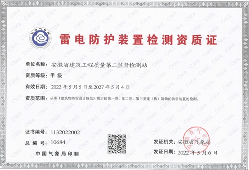 5月6日,根据安徽省气象局批准认定,省质检二站荣升雷电防护装置检测甲级资质。本次资质升级认可批准通过标志着二站已具备从事《建筑物防雷设计规范》规定的第一类、第二类、第三类建(构)筑物防雷装置的检测能力。