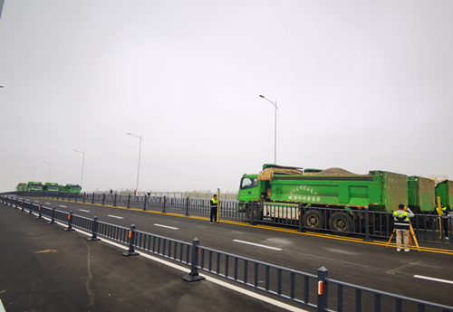 在前期精心制定试验方案的基础上,二站现场投入20余名技术人员,划分为设备组、联络组、测量组等6个小组,各司其职,有序高效。在现场技术人员的指挥下,荷载试验按方案依次开展。静载试验时采用9辆三轴载重汽车按不同工况、不同位置分级对各控制截面进行等效加载,变化着花样“考验”大桥,检验结构的强度、刚度和抗裂性等工作性能,通过环境随机激振法、行车激振法和跳车激振法测试桥跨结构的动力特性。现场配备精度高、抗干扰能力强的无线动、静态采集分析系统及高精密电子水准仪对应力(应变)、位移、自振频率等参数进行实时采集分析。在整个试验过程中,大桥各测试参数正常,整体表现优良,顺利通过各项“考验”。