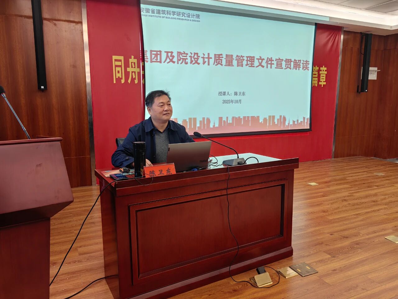 陈卫东以“集团及院设计质量管理文件宣贯解读”为主题,对《关于强化设计质量管理体系的通知》《关于强化设计项目后期服务管理的通知》《安徽建工集团控股(股份)有限公司工程质量事故调查处理和责任追究办法》《安徽省建筑科学研究设计院工程质量缺陷责任追究细则(试行)》等制度文件进行详细解读,并结合实际案例,详细阐述了各项制度的核心内容、执行要点与责任划分,强调了在设计全过程及后期服务中落实质量管理要求的重要性。此次培训在强化质量责任意识,推动质量管理要求在全过程、各环节的落地执行,为提升工程品质、防范质量风险提供了坚实的制度保障。授课结束后还针对本次培训内容,组织了“质量管理”专题线上测试。