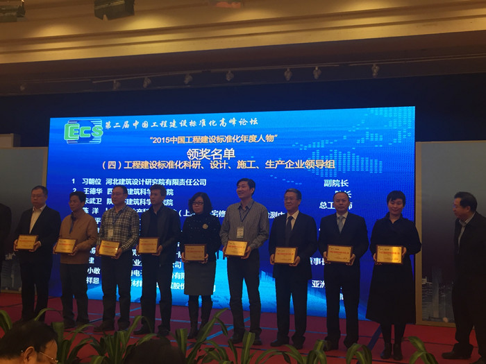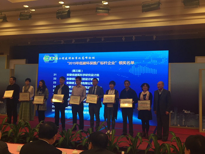 会上宣读了关于发布“2015中国工程建设标准化年度人物”与“2015年低碳环保推广标杆企业”的通知,根据本次征集活动工作的要求,本着公平、公正、公开和择优的原则,经中国工程建设标准化协会和中国建设报社组织评选,决定授予我院董事长项炳泉等50名同志“2015年工程建设标准化年度人物” 荣誉称号,授予安徽省建筑科学研究设计院等50家单位“2015年低碳环保推广标杆企业” 荣誉称号。