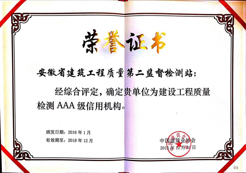 近日,安徽省建筑工程质量第二监督检测站顺利通过中国建筑业协会审批,荣获建设工程质量检测机构信用等级最高评价——“建设工程质量检测AAA级信用机构”荣誉称号。