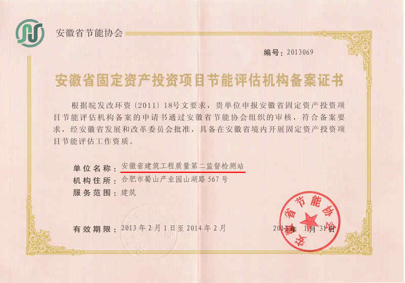 为贯彻实施国家发展和改革委员会《固定资产投资项目节能评估和审查暂行办法》,认真落实《安徽省<实施固定资产投资项目节能评估和审查暂行管理办法>细则》,规范固定资产投资项目节能评估工作,依据省节能协会审查并经安徽省发展和改革委员会2013年2月2日批准,安徽省建筑工程质量第二监督检测站成为安徽省固定资产投资项目建筑节能评估单位。