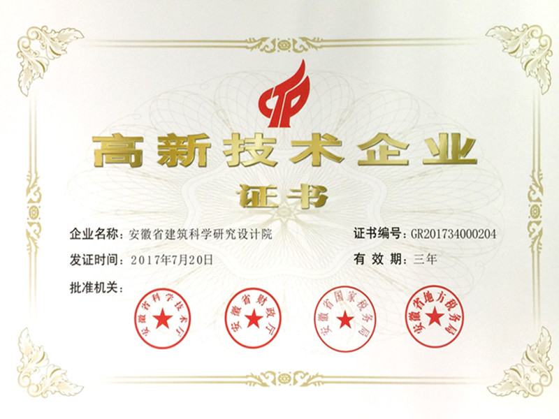 金秋时节,安徽省建筑科学研究设计院继2008年、2011年、2014年后,再次收获“国家级高新技术企业”荣誉称号。高新技术企业由安徽省科学技术厅、安徽省财政厅、安徽省国家税务局、安徽省地方税务局联合颁发的《高新技术企业证书》(证书编号:GR201734000204),发证时间为2017年7月20日,有效期三年。