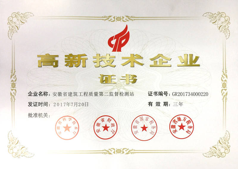 11月15日,安徽省建筑工程质量第二监督检测站收到了由安徽省科学技术厅、安徽省财政厅、安徽省国家税务局、安徽省地方税务局联合颁发的《高新技术企业证书》(证书编号:GR201734000220),发证时间为2017年7月20日,有效期三年。