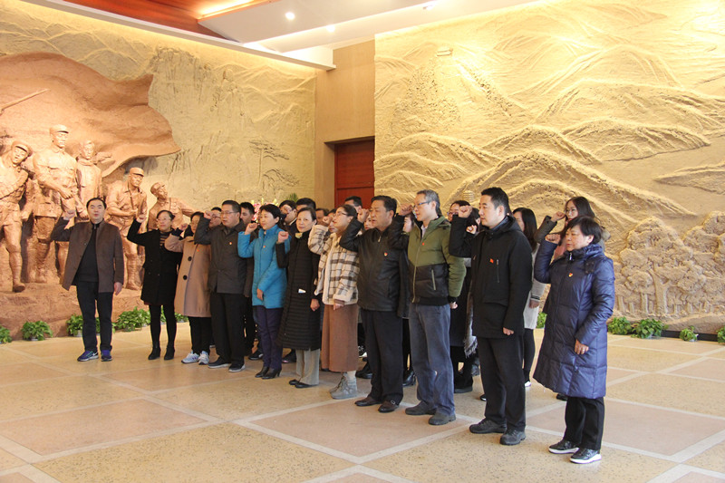 在纪念馆一楼大厅,面对鲜红的党旗,党委委员、副院长李跃进同志带领全体党员重温入党誓词。李院长号召全体党员要铭记入党誓词,不忘入党初心,以百倍的热情和干劲,奋力展现出新时代的新气象、新作为。