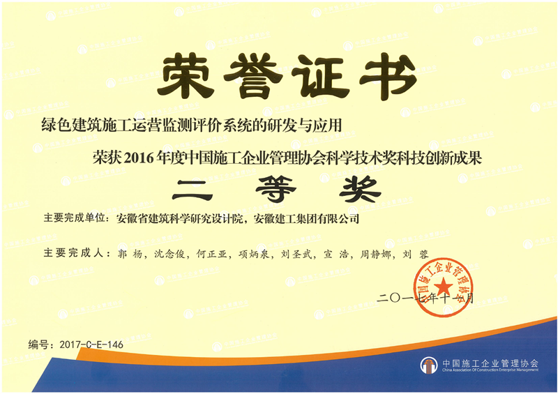 近日,中国施工企业管理协会下发了《中国施工企业管理协会关于表彰2016年度科学技术奖的决定》(中施企协字〔2017〕64号)文,公布了2016年度中国施工企业管理协会科学技术奖科技创新成果获奖名单。由安徽建工集团有限公司、安徽省建筑科学研究设计院完成的《绿色建筑施工运营监测与评价系统的研发与应用》成果荣获“中施企协科学技术奖科技创新成果二等奖”。
