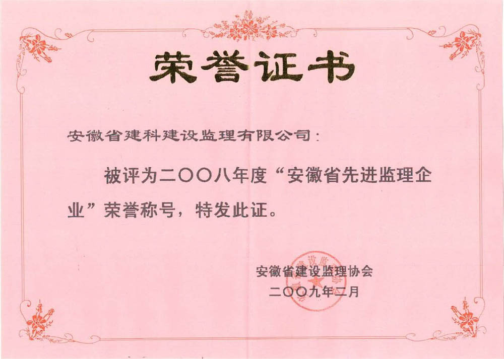 近日,从安徽省建设监理协会获悉,安徽省建科监理公司获得2008年度“安徽省先进监理企业”荣誉称号。李殿文、李建华两位同志被评为“安徽省优秀总监理工程师”。