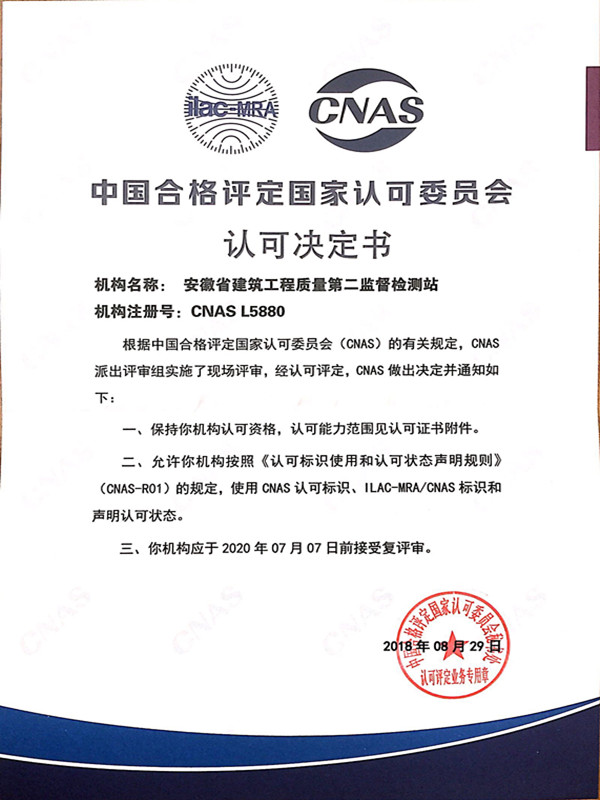 近日,中国合格评定国家认可委员会(CNAS)官网正式公布安徽省建筑工程质量第二监督检测站实验室通过CNAS实验室复评审工作,再次获得中国合格评定国家认可委员会认可决定书。
