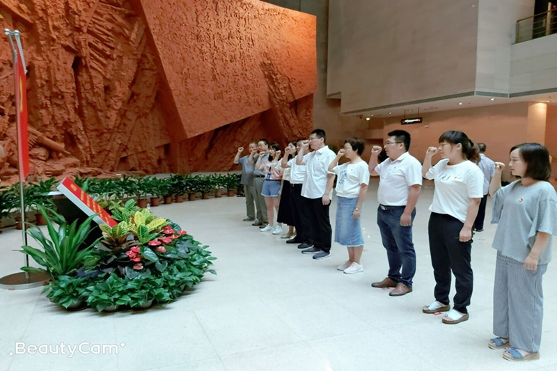 在纪念馆一楼大厅,面对鲜红的党旗,监理公司党支部书记高屹带领全体党员高举右手重温入党誓词,表达了对党的无限忠诚和崇高敬意。