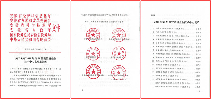 自2019年3月份开始,经过多环节评审,省经信厅、省发改委、省科技厅、省财政厅、省税务局、合肥海关联合发文(皖经信科技〔2019〕175号),正式认定安徽省建筑工程质量第二监督检测站技术中心等149家企业技术中心为第28批安徽省企业技术中心。