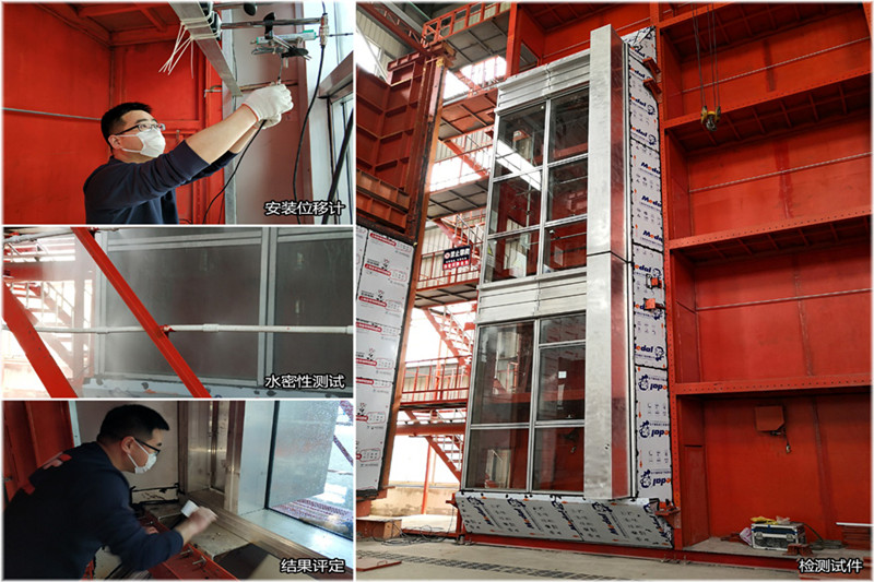 单元式玻璃幕墙由检测委托方先行安装,达到检测条件后,选派技术熟练员工进行设备的安装调试与检测工作,主要包括气密性、水密性、抗风压与平面内变形四项性能所需的淋水装置布置、支架安装、位移计布点、线缆接驳、设备起停、软件参数设置与运行等。测试完成后,幕墙所开展了深入地技术交流,并就结果计算、误差分析、等级判定等数据处理相关工作进行了讨论。