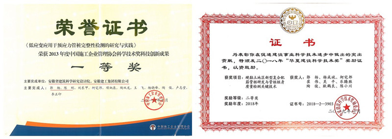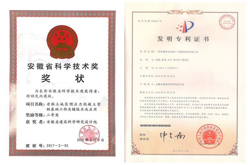 2012年-2019年,《一种管桩桩身混凝土全截面强度检验方法》等多项发明专利获得授权,《预应力混凝土管桩技术标准》等十余部标准或规程发布实施,安徽省科学技术奖、华夏建设科学技术奖、中国建筑业协会科学技术奖、安徽省优秀勘察设计奖等各类荣誉和奖项不胜枚举;
