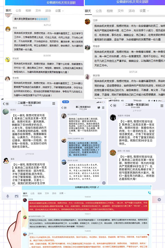 所属机关党支部、二站党总支、监理公司党支部以QQ群祝福短语接龙的形式,表达爱党之情。“我来自机关党支部,我想对党说:作为一名基层党务工作者,我的第一身份是共产党员,第一职责是为党工作,一直以来,我坚持从严要求自己,牢记自己党员身份,履行党员责任义务,认真对待和保质保量完成党组织交办的各项任务,坚决反对形式主义官僚主义之风,做到踏踏实实做事,本本分分做人,我将继续坚守入党初心,保持奋斗精神,为建科4.0转型发展贡献自己的青春和力量”……。一场“云”端祝福接力赛点燃了党员的入党初心,激励了党员的使命担当。
