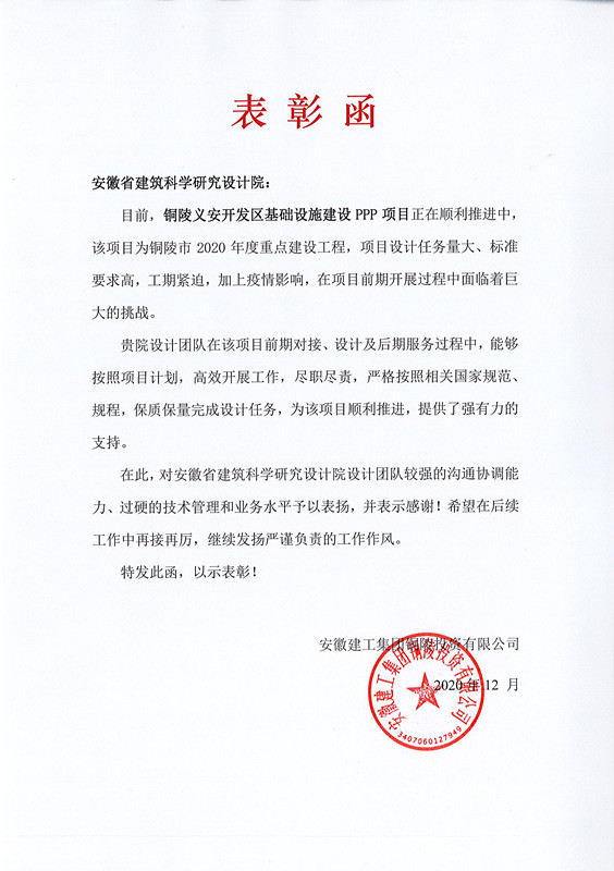 近期,安徽建工集团铜陵投资有限公司发来表扬信,对我院市政一所在铜陵义安开发区基础设施建设PPP项目工作中的表现给予肯定,并予以表扬。