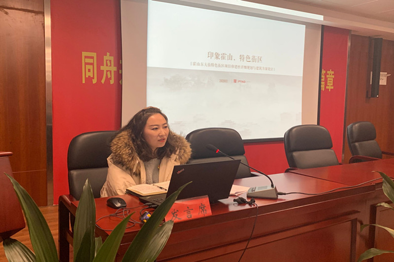 会上,规划分院规划师朱钰围绕“霍山东大街特色街区项目规划与建筑方案设计”投标项目,从效果展示、项目概况、设计理念、方案生成、整体规划、景观设计、建筑风格等方面向大家做了精彩的汇报。“霍山东大街工程项目规划和建筑设计项目”是我院规划分院与柏涛建筑设计(深圳)有限公司联合投标的成功示范,该项目位于霍山旧城最东侧,紧邻护城河及城东大门,总建筑面积102288.92平方米,该项目主要为展现霍山特色,锁住老街记忆,通过新旧融合的手法,打造宜商宜居的特色活力街区,激发城市魅力,塑造霍山文化的新名片。交流会主题鲜明、内容翔实、特色突出、条理清晰,具有较强的指导性、针对性和应用性。