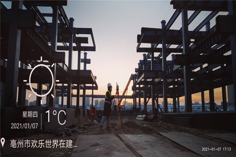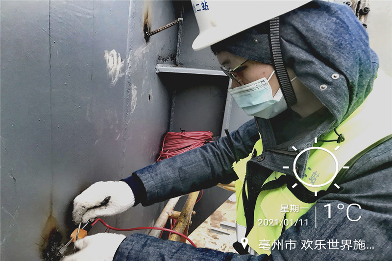 2020年末,在岁末年初、辞旧迎新之际,二站结构二所便早早地开始研究谋划部署,积极寻求新业务突破,与北京城房有限公司就“亳州欢乐世界项目智慧城市生活体验馆钢结项目”签订协议。该工程钢构件从出厂检测到施工过程中应力、变形全过程监测均由我站结构二所承担,为首个全过程介入的钢结构项目。该项目强度大、条件苦,加上天气、现场工作条件、夜间作业等种种困难,任务十分艰巨。二站结构二所副所长李平介绍说:“二站监测业绩稀缺,实践经验和技术的磨练更为重要”。于是,李平综合权衡轻重后,决定暂停其他检测项目,迅速拉起队伍,带领二站结构二所检测精英小分队于2020年最后一天凌晨抵达工程现场,打响了2021年检测业务第一枪。
