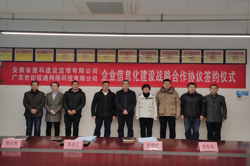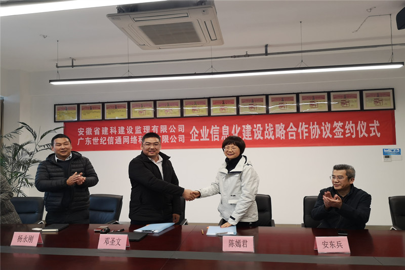 3月5日,安徽省建科建设监理有限公司与广东世纪信通网络科技有限公司就全面开展企业信息化建设举行签约仪式。院党委委员、副院长、总建筑师安东兵、建科监理公司总经理陈嫣君、党支部书记高屹、广东世纪信通网络科技有限公司副总经理、上海分公司经理邓圣文、副经理郑林洪以及相关人员出席签约仪式。