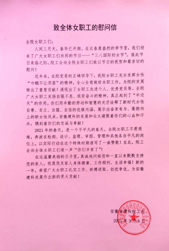 3月8日当天,院工会通过CES协同系统、微信公众号、电子屏等宣传平台,向全院女职工发出了慰问信和祝福卡片,并为每位女职工赠送了玫瑰花,积极营造了温馨的浓厚节日氛围。此次活动是院工会开展的“巾帼心向党,建功新时代”主题系列活动之一,共有200余名女职工参与了活动。