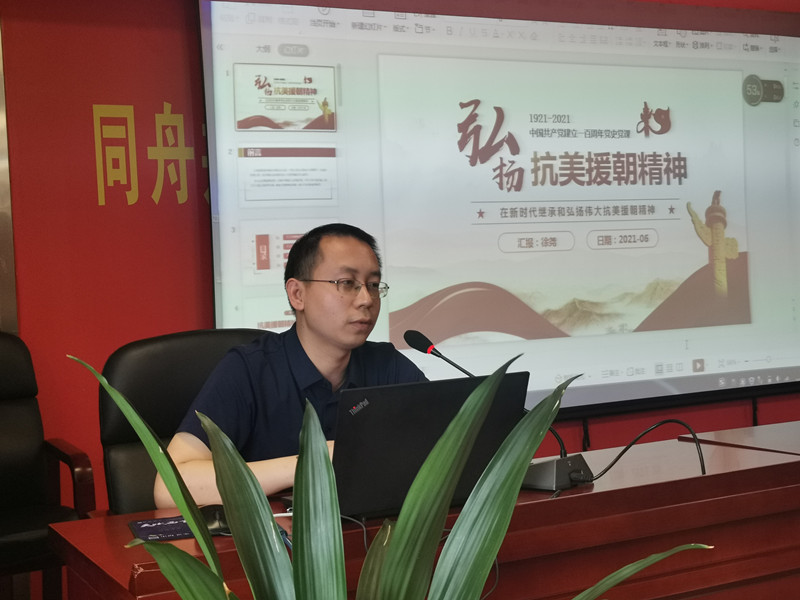 会上,姚传山书记首先带领与会党员集体学习了人民日报头版刊发“宣言”署名文章《社会主义没有辜负中国》,要求支部党员坚定对马克思主义的信仰、对社会主义和共产主义的信念,从党史中汲取前进的力量,在学习中增强信仰信念信心,牢记初心使命,建功立业新时代。随后,徐尧总监以《弘扬抗美援朝精神》为题,从抗美援朝精神产生的背景、抗美援朝精神的丰富内涵、抗美援朝精神的时代价值、在新时代继承和弘扬伟大抗美援朝精神四个方面,给支部党员上了一堂生动、精彩的主题党课。党课以抗美援朝历史背景为主线,通过史实资料与案例分析,深入浅出地讲述了71年前中华民族不屈不挠反抗侵略的抗美援朝故事,大力弘扬了以爱国主义和革命英雄主义为核心的抗美援朝精神。党课具有较强的思想性、现实性和指导性,帮助党员们加深了对抗美援朝战争的历史背景和重要意义的认识。会议最后,姚传山书记结合近期党委工作提示函要求,对党史学习教育、主题党日、换届改选等工作进行了部署和要求。