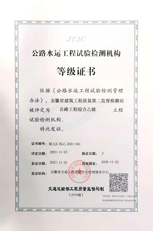 11月23日,从安徽省交通工程质量安全管理服务中心传来喜讯,二站顺利通过公路工程综合乙级等级评定。