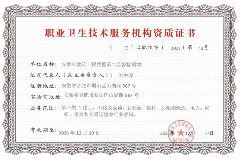 近日,经安徽省卫健委认定,二站顺利取得职业卫生技术服务机构资质证书。