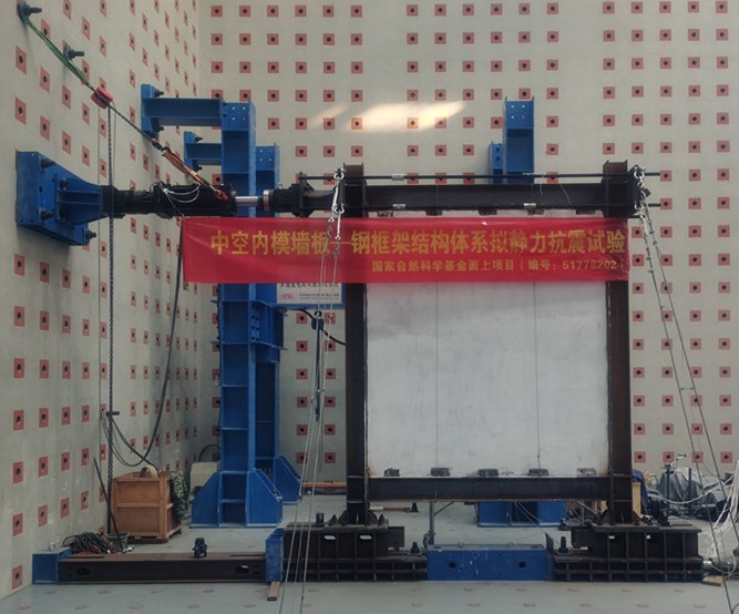 近日,我院省重点实验室完成合肥工业大学委托的“中空内模墙板-钢框架结构体系拟静力抗震试验”。该试验主要依托国家自然科学基金面上项目“拉结式双钢板组合剪力墙结构抗震性能与设计方法研究(No.51778202)”科研项目,利用500kN作动器和多通道电液伺服控制系统对1个钢框架与4个中空内模墙板-钢框架结构开展拟静力试验研究。