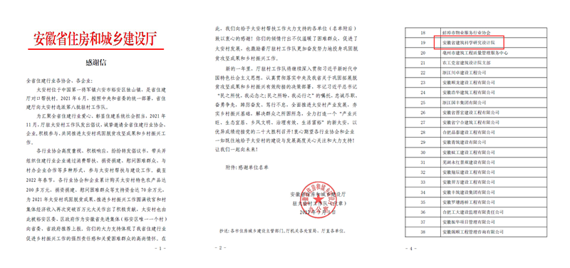 日前,安徽建科收到来自安徽省住房和城乡建设厅驻太安村工作队发来的感谢信,对安徽建科在六安市裕安区独山镇太安村帮扶工作中给予的大力支持表示感谢。