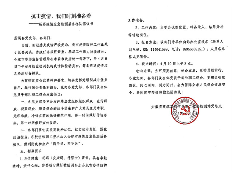 在市委市政府的统一部署下,合肥市市场监督管理局于4月9日下午紧急召开检验检测机构疫情防控动员会,号召全市检验检测人员加入疫情应急检测后备梯队,时刻准备投入抗“疫”战斗。