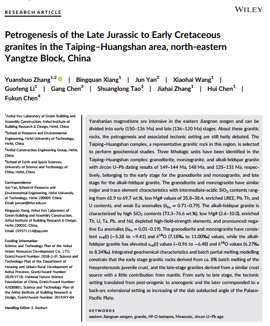 近日,我院绿色建筑节能与绿色建材研究组在机制砂母岩原材料研究领域取得新进展,相关研究成果发表在国际期刊《Geological Journal》(GJ Q3, IF=2.489)上,论文题为“Petrogenesis of the Late Jurassic to Early Cretaceous granites in the Taiping-Huangshan area, north-eastern Yangtze Block, China”,张元朔博士为论文第一作者,党委书记、董事长项炳泉,教授闫峻为论文通讯作者,该项工作得到了国家自然科学基金项目、安徽建工集团、安徽省建筑科学研究设计院等单位科学计划项目经费资助。