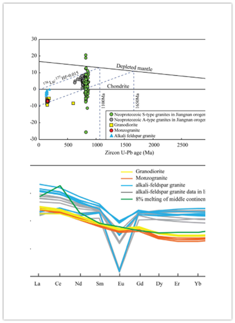 该成果研究了皖南地区花岗岩类型、主要矿物成分等特征,通过不同类型花岗岩主微量元素特征与放射性同位素衰变周期和衰变核量推断出皖南地区不同类型花岗岩之间的协变关系;通过数值计算和模拟创新性的提出花岗岩产生于不同比例古老地壳的部分熔融和深部岩石圈地幔参与反应的踪迹。