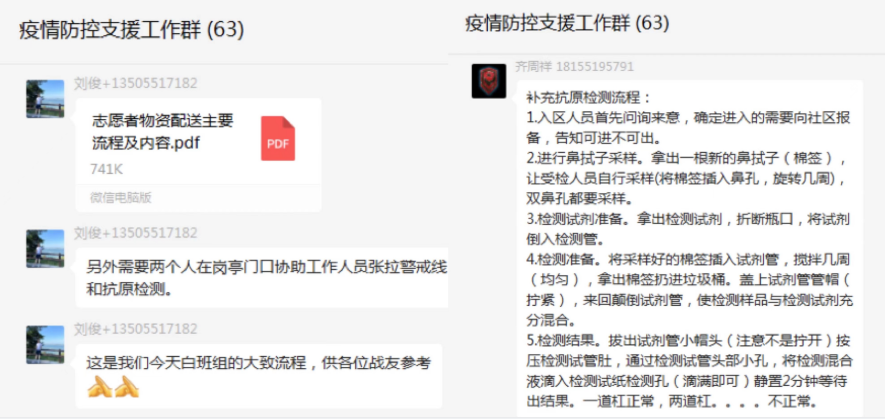 晚上8时,晚班6名志愿者准时达到现场,接过了社区战疫接力棒。忙碌了整整12个小时的白班志愿者们,返回家中的第一件事就是复盘总结,在“疫情防控支援工作群”中分享战疫经验,细化相关工作流程。