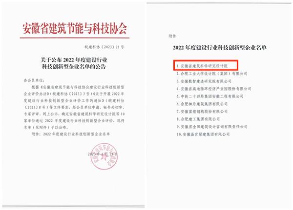 近日,安徽省建筑节能与科技协会公布2022年度建设行业科技创新企业名单,我院成功上榜。