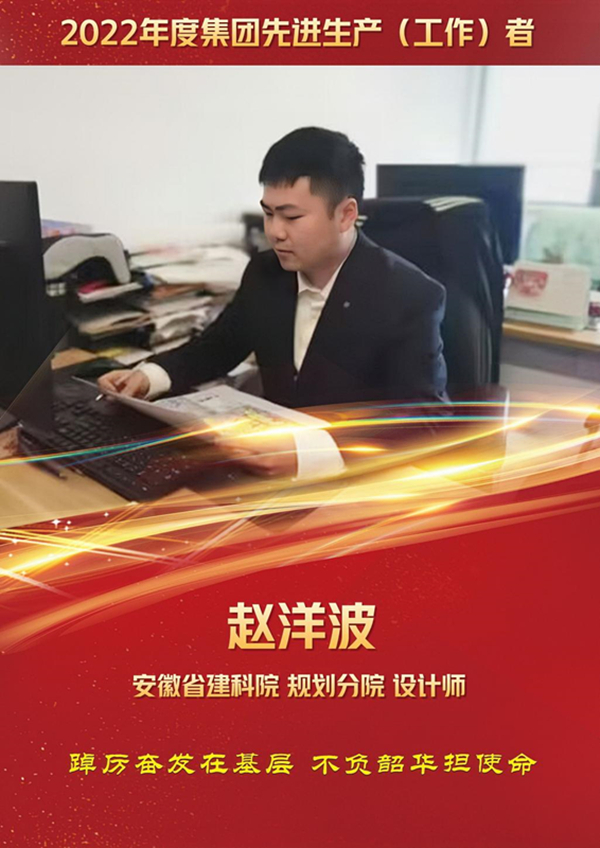 赵洋波,男,32岁,中共党员,高级工程师。安徽建筑大学本科毕业加入安徽建科院规划分院,至今已工作十余年。该同志主要从事城乡规划和风景园林设计工作,多年担任项目负责人。2022年他积极响应省委组织部和集团的号召,成为一名挂职干部。面对新的挑战他发挥共产党员不忘初心,牢记使命的责任感,踔厉奋发,工作成效突出。