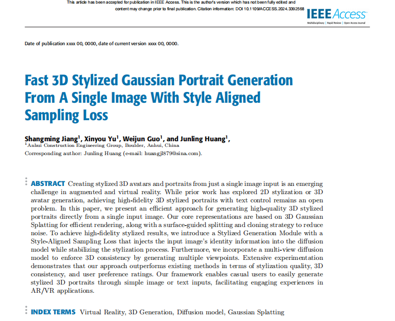 近日,安徽建科总承包分院撰写的《从单个图像快速生成具有样式对齐采样损失的3D风格化高斯肖像》SCI论文通过审核,并且在最新一期的IEEE Access期刊上发表,出版日期为2024年4月23日。