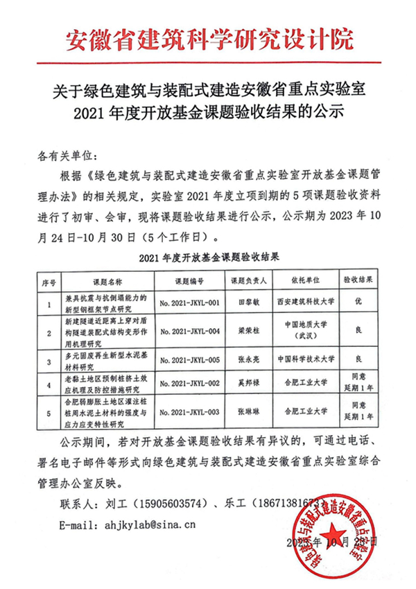 关于绿色建筑与装配式建造安徽省重点实验室2021年度开放基金课题验收结果的公示