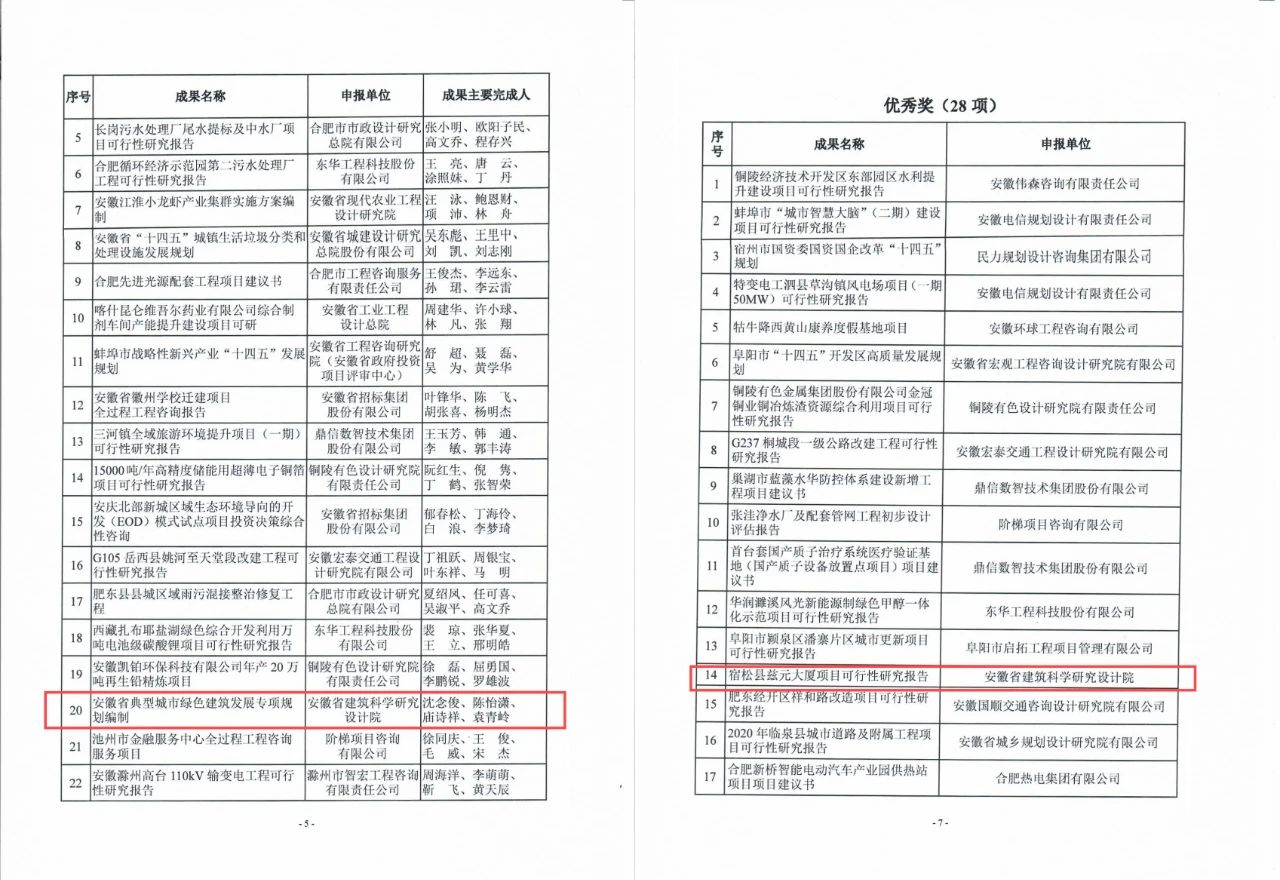 近日,安徽省工程咨询协会公布了2024 年度安徽省工程咨询协会优秀工程咨询成果奖评选结果,由我院完成的“安徽省典型城市绿色建筑发展专项规划编制”和“宿松县兹元大厦项目可行性研究报告”分别获得三等奖和优秀奖。